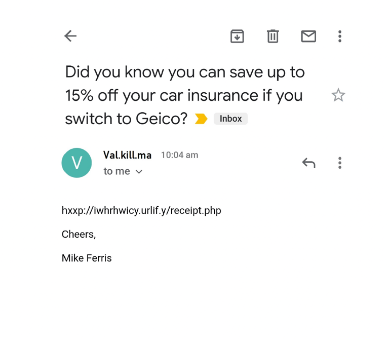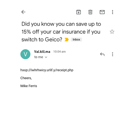 The email does not request the recepient to open any links and no threats are being exchanged.
