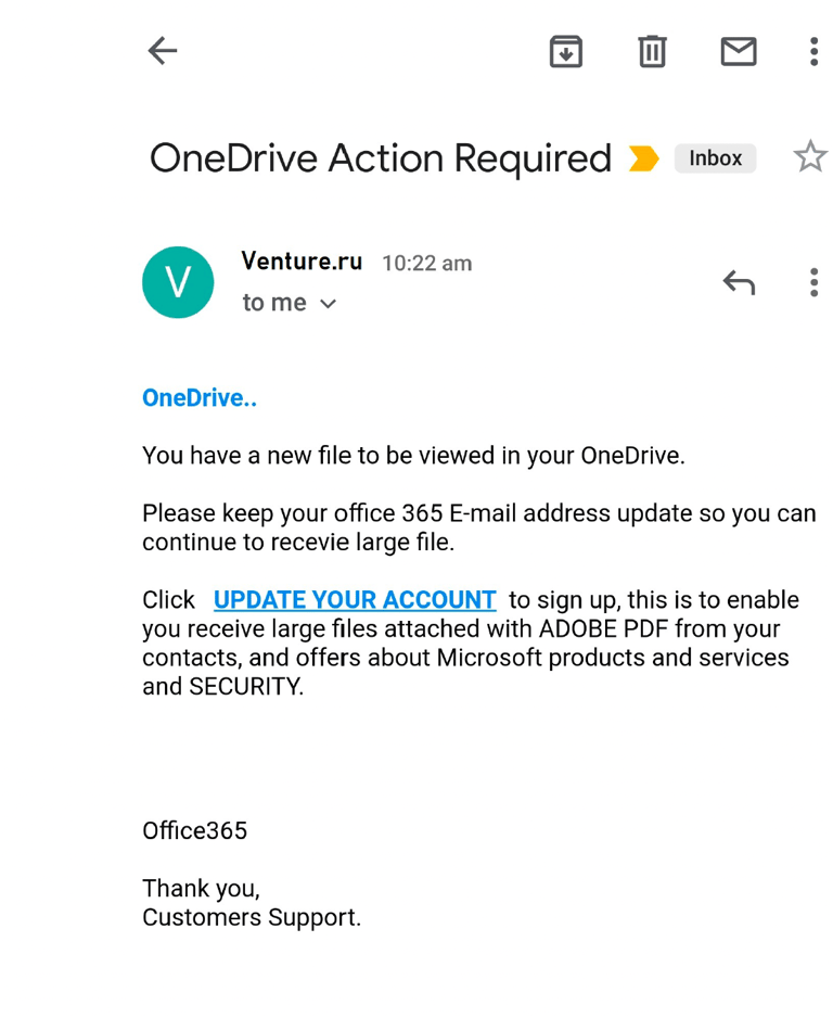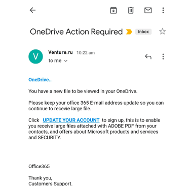 The email claims to be from Microsoft’s software called One Drive, however, the sender’s username indicates that it is from Venture in Russia(.ru).