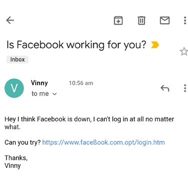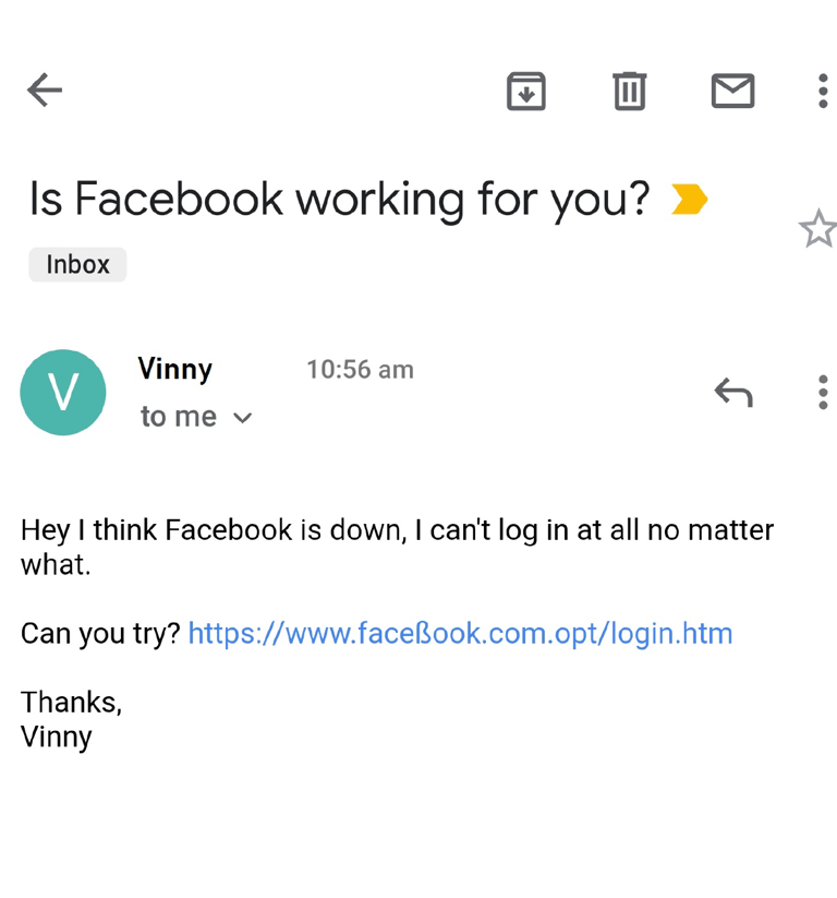 The hyperlink contained in the email has a typo where the ‘b’ in facebook is changed to a special character. This indicates that the link is not an authentic Facebook domain.