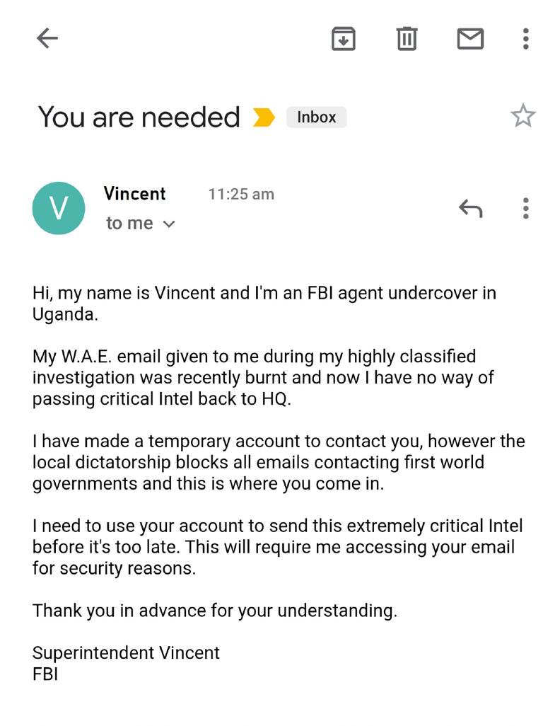 The sender claims that they work for the FBI and even though they say that their account was compromised, it does not come from an offiial FBI email address so it should be disregarded.